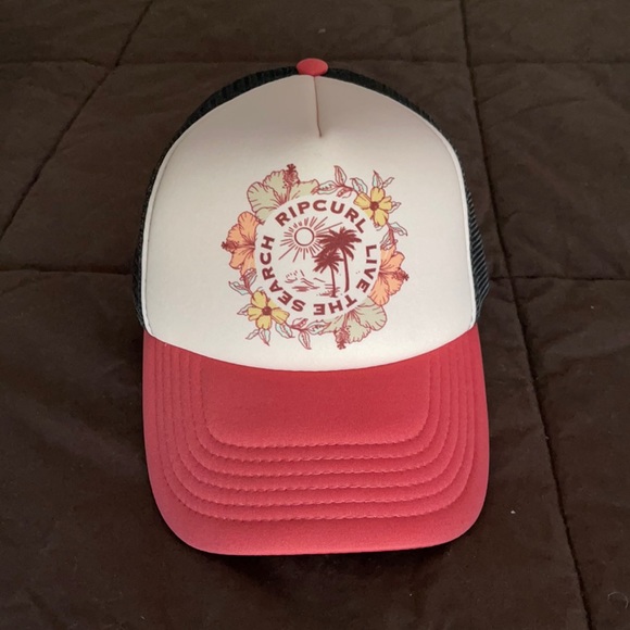 Brand new and never worn Rip Curl trucker hat! Adjustable. Black mesh, coral color bill and Live the Search moto.