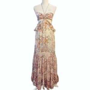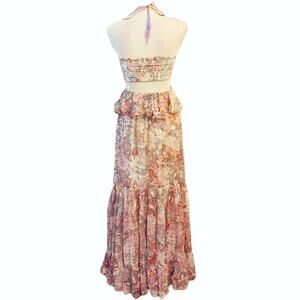 New without tags Rococo Sand Paola halter maxi dress. Cutout with bandeu bust and halter tie straps with beaded tassels. Ruffle at waist. Ruffle hem. Metallic floral in white, pink & blue.