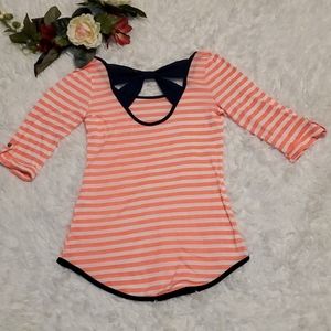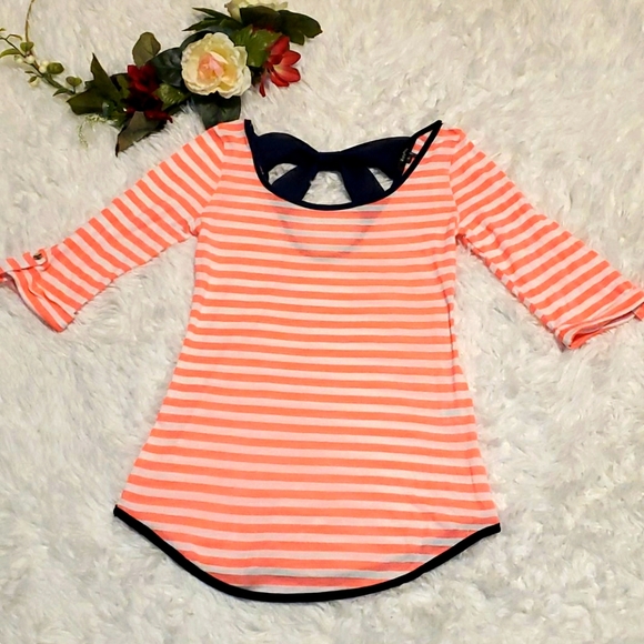 Cute Roly Poly long top with cuffed sleeves secured by a button size S. Pink and white striped top with a navy blue criss-cross bow on the back. NWOT!! Pair it with your favorite leggins or jeans!! 💁♀️