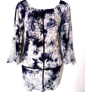 You are looking at a beautiful NWOT Romeo and Juliet Couture brand black and white tie dye tunic with lace embroidery details. This is such a pretty and unique piece, and has an adjustable elastic collar so you can wear it on or off your shoulders!