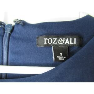 Small Navy Blue Roz & Ali Jumpsuit with navy blue belt, lavander, white, and Blue Strips down sides, side shoulder cut sleeves. Never worn.