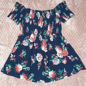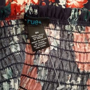 NWOT! Rue21 Plus (Rue+) babydoll top. Beautiful navy blue with a multi color floral print! As cute as it looks, perfect for the warm weather! Off the shoulder style with a rouched top to fit tightly over the chest and has a flowing bottom. Hem line is slightly high-low. Size is 2X.