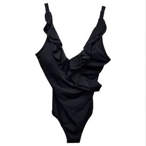 NWOT Ruffled V-Neck Solid Black One-Piece Swimsuit Women's Small 1pc Swimwear