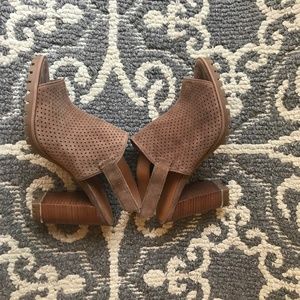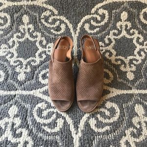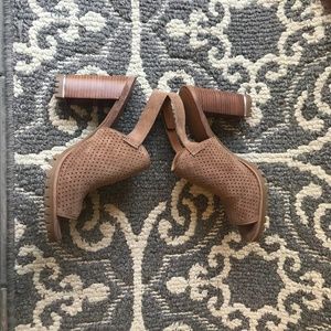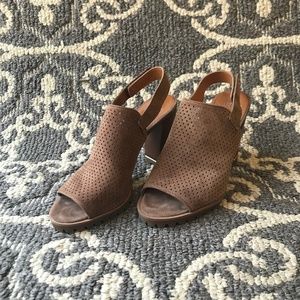SARTO BY FRANCO SARTO Analise Block Heel Sandal in color Toffee. These heels have only been tried inside and have a beautiful brown perforated suede upper to compliment the beautiful wooden block heel.