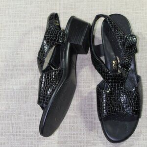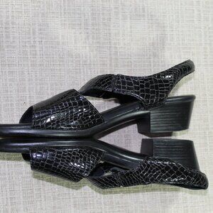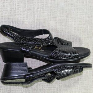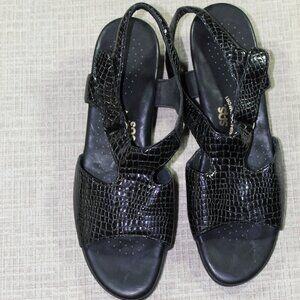Very nice SAS sandals. Beautiful black alligator skin pattern. Tri pad comfort inner soles. New without tags condition - one call out is a smudge on the back of one heel. See pictures.