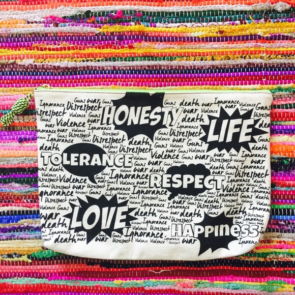 NWOT large clutch with amazing message. Can be used as a clutch or cosmetic bag. Never used size 14'x10 1/2'.