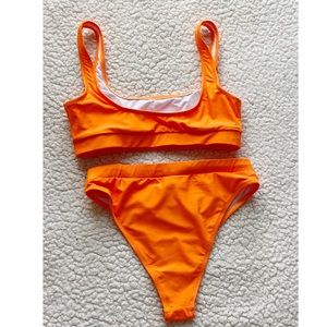 SHEIN 2 piece orange bikini. This is for both top and bottom bikini set. Got for trip but never wore. This fun vibrant set is perfect for the beach. The top has removable pads and bottom still has the protective liner attached. Flattering style and no ties to worry about.