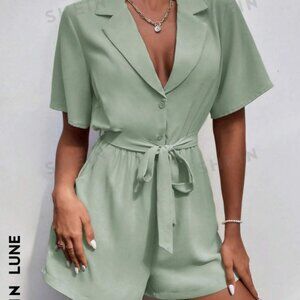 NWOT SHEIN LUNE Lapel Neck Belted Shirt Romper in Mint Green size L
