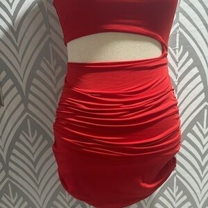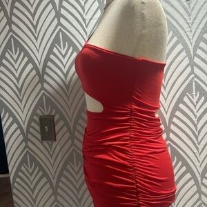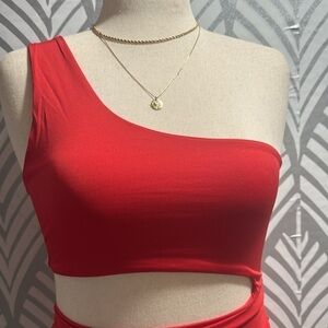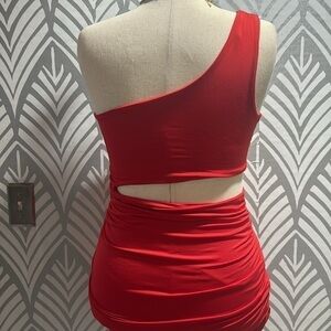 NWOT SHEIN red cutout dress . One shoulder. Rouging on both sides of dress. Size large/8-10. Fabric is polyester. Firm fitting.