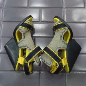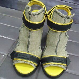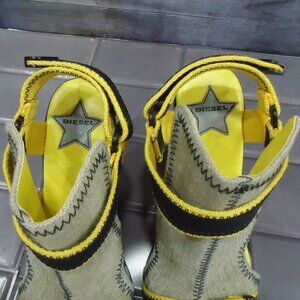 NWOT. SIZE 38. Diesel open toe wedge heel sandals. Open Toe. Brand new. Cotton canvas upper. Chunky heel. Velcro closure: hook and loop strap. These shoes have never ever been worn. May be slight difference in color due to lighting. The canvas is a "cement" color. The heel is about 4.5”. Cute strappy details throughout. From a smoke-free home. Newer worn. NEW condition. Please zoom in all pictures for details and condition. Item in pictures is the exact item you are purchasing.