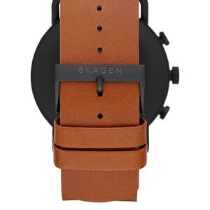 Slender lugs and classic pushers promote the sophisticated black stainless steel and brown leather design of Skagen's touchscreen Falster 3 smart watch. Style #SKT5201