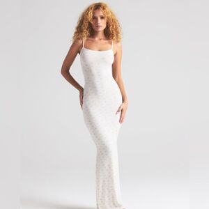 SKIMS soft longe white dress. Actual dress is completely white. Perfect for any occasion. Its sleek design offers a flattering fit, making it a must-have addition to your wardrobe. Super comfortable.