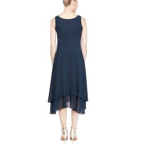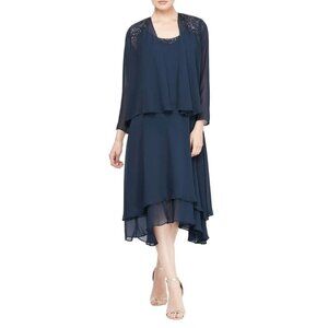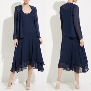 NWOT SLNY Embellished Scoop Neck Tiered Chiffon Midi cDress w/ Jacket in Navy