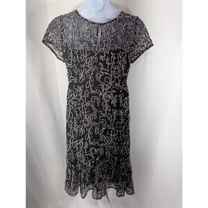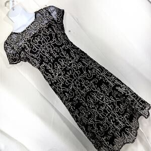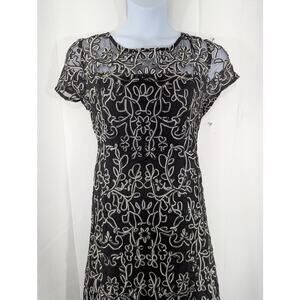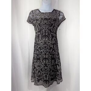 From SL New York, this amazing dress features cream ribbon embroidery on black net! With a sheer top bodice and sleeves, short, shift style, midi length! Just lovely, squiggly abstract floral pattern! Fully lined in black stretch, back button at neck and zipper! Size 16, ***NEW Without Tags, and Guaranteed Superb by Lily @HauteClub!*