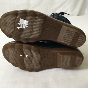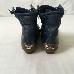 New without tag condition- Never worn outside of store. Calling them NEW without tag because part of the tag is missing. Quilted nylon top, waterproof rubber bottom, blue Sperry duck boots with leather laces and trim in rare half size of 9.5. The blue looks more like a dark steel blue to me, not quite a royal blue and not as dark as navy blue. Last photo taken outside. Only blemish I could find is one small scuff to the rubber (see photos).
