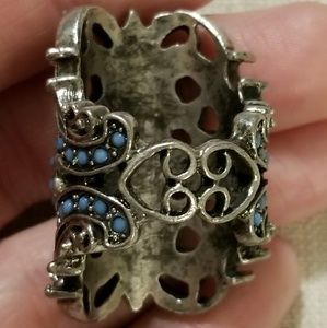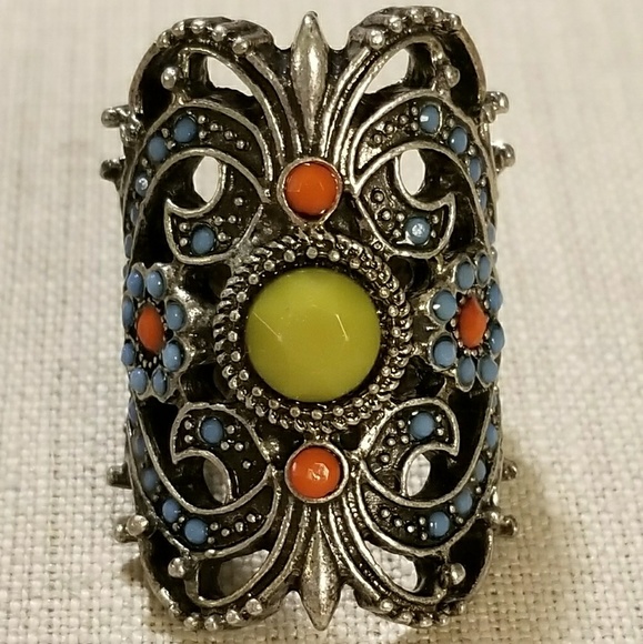 - Wide band - Very detailed - Antique silver - Yellow, orange and blue stones