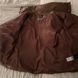 Puffer jacket with snap front closure from Avec Les Filles. Saddle brown with ThermaPuff insulation. High collar that can be buttoned up or left open. Size large, in like new condition.