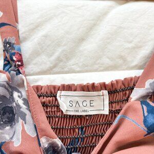 Sage The Label matching set in a dusty rose background with blue and ivory floral print. Two-piece outfit features: