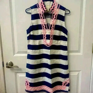 The hallmark design that launched Sail to Sable, this classic tunic silhouette is a time honored favorite. This sleeveless tunic dress has a stand up collar with a tailored shift style. Bold navy and white stripes with a soft pink ric rac trim, this shift will be your go-to for warmer weather.