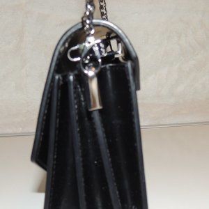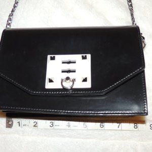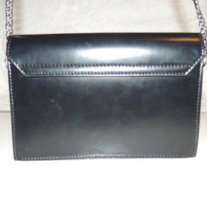 Black Patent calfskin leather crossbody bag with silver flip-clasp closure.