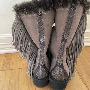 Sam Edelman Tilden Grey Suede Faux Fur Lined Side Fringe Boot with snakeskin detail down the back in women's size 7. Side zipper entry. Never worn, and come from a smoke and pet free home.