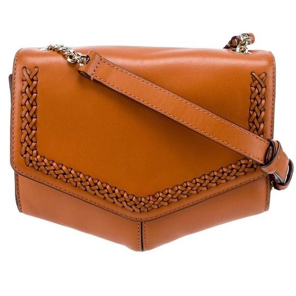 Sandro "Lou MM Curcuma" Camel Cognac Leather Crossbody Bag Goldtone Hardware Adjustable Strap Braided Accents & Dual Exterior Pockets, Suede Lining & Single Interior Pocket, Snap Closure at Front