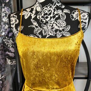 NWOT Saylor Cydney midi dress in a vibrant yellow-gold crushed velvet with a unique, shimmery reptile skin print. Features spaghetti straps, elegant side leg slit and draped silhouette for a flattering fit. Crafted in a blend of velvet-soft fabric (95% polyester, 5% spandex)—stretchy and comfortable for all-day wear. Original MSRP $242.