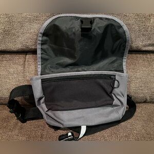 Two inner pockets, 2 outer zip pockets. Buckle closure and buckle waist closure.