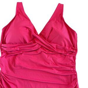 women's swimsuit, one-piece swimwear, ruched swimsuit, adjustable straps, hot pink swimwear, Sea Level Swim, eco-friendly swimsuit, size 16 swimwear, recycled nylon swimsuit, supportive swimwear, vibrant swimwear, flattering fit swimsuit, summer beachwear, bbq, pool party, beautiful, sexy, sassy, date night, party, event, girls weekend, summer, winter, fall, spring