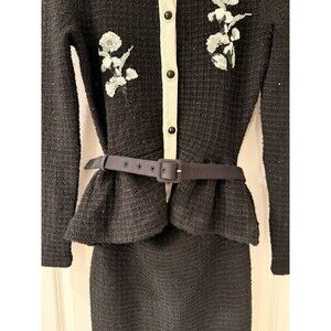 Floral sequin motifs and striking contrast trims bring ladylike polish to this black textured knit dress. A belted peplum waist flatters the form add our statement jewellery for date night.