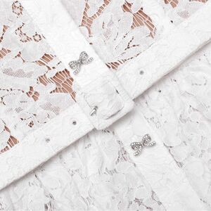 Cut from white lace for its rich texture, this dress boasts an elegant peplum and diamanté bow buttons. Belted at the waist to flatter the form, wear with heels to show off its fitted midi skirt.