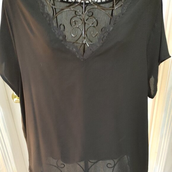 Black lace trimmed top. Lace goes around V-neck in front and continues around the back of top. Appears new. Semi-sheer. Short sleeve. No brand tag. 95% poly + 5% spandex. Pit 2 pit 25". rear neck to hem 29". Over the head. No zippers or buttons. (js14)