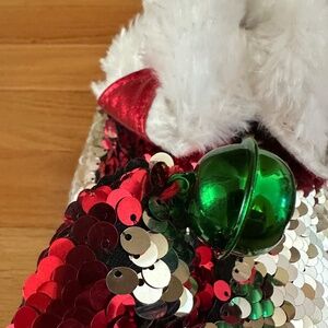 NWOT Sequin Elf Slippers Size S/M Red Silver Sequins. Jingle as you walk in these fun elf slippers with reversible red and silver sequins. Rubbed one way the sequins are silver and rubbed the opposite direction turns the slippers red. Green jingle bell sewn on the turned up tip of each slipper. White, plush faux fur, cuffs the slipper opening just above the ankle. Red interior is very padded and hugs the foots comfortably, yet allows for different size feet. Size Small/Medium (5-8) printed on the bottom of each slipper. I wear an 8.5 narrow shoe and these slippers fit me; although just a tiny bit too short. I would wear them and be comfortable. Bottom foot pad length is: 10"; total length of slipper bottom: 12". Excellent, new, never worn condition.