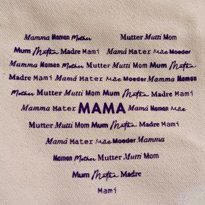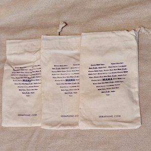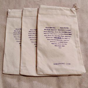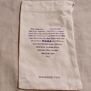These adorable drawstring bags are from the European maternity brand Seraphine. This listing is for a SET of 6 identical bags. All are made of a durable natural cotton fabric that has some texture to it. The bags are printed with a sweet design in the shape of a heart that says Mama in many different languages (see close-up photo). They cinch with a drawstring. These would make great goodie bags/gift bags for a baby shower. Each one measures 11 inches long by 6.5 inches wide. Machine washable. Colors are: off-white (undyed cotton) fabric and pull cord, plus purple printing. These have never been used and are in new condition. However, one of the bags has a small, subtle blue mark at the top (see close-up photo). It came that way.