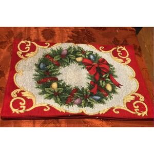 Set of 2 reversible tapestry Christmas placemats are new without tags, never used. One side has a snowman surrounded by swirls and snowflakes and the other side has a beautiful wreath with Christmas lights. Nice heavy feel to them. Measures 17” x 12”.