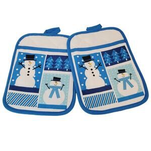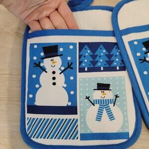 NWOT Set of 2 Snowmans Blue & White Oven Mitts. Kitchen decor. Holiday decor. Winter Decor. Comfy with nice grip. Bright blue and white. Super cute Snowmans. Size 7''x9''