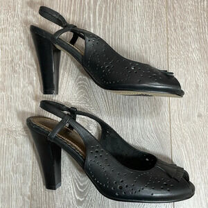 NWOT Seychelles Black Leather Slingback Pumps Heels in size 7.5. They have a few minor marks from storage as shown in photos. Open peep toe, perforated black leather with tassel like design on toes, slingback strap has elastic portion, cushioned footbed. Please see photos for approximate measurements and details. Item may show difference in color based upon photography and perception. Photos are part of the description, as everyone’s level of condition may vary. From smoke free and pet free home. All packages are shipped the same or next business day.