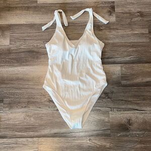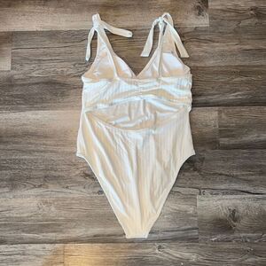NWOT Shade & Shore Cream Plung Front Shoulder Tie Ribbed One Piece Swimsuit Larg