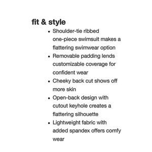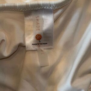 This swim suit is made by Shade & Shore. It is a cream ribbed one piece style with ties and the shoulders and a cute back. Size large and NWOT. Hygienic liner is still in place. Smoke and pet free home.
