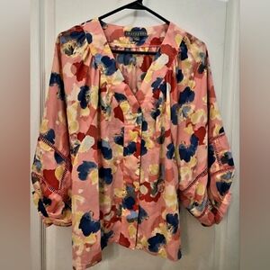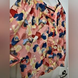 This Sharagano blouse showcases a vibrant blue, red, white and yellow balloon pattern against a peach colored background. Features include raglan sleeves, a V neckline and hidden buttons down the front (see photos). The artistic graphic design adds a unique touch, making it a standout piece for any wardrobe.