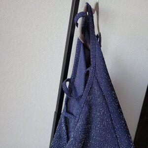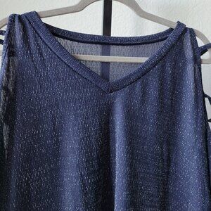 NWOT Shein Curve dark navy blue cold shoulder short sleeve top with small mattelic threading in silver, gold and dark blue tones. The top is women's size 4XL