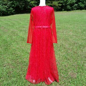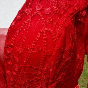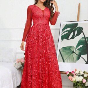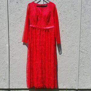 Lovely red formal with lace overlay from Shein Belle. Full length, flowing skirt, long mesh sleeves, plunging sweetheart neckline with mesh inlay, back zip, padded bust, attached waist accent, skirt & bodice lined. 100% poly. Machine washable. NWOT. Size XL/12.