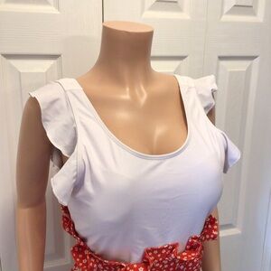 Shein Womens Plus Size Red Ditsy Floral Ruffled One Piece Swimsuit Size 3XL. New without tags. Hygiene liner still attached. From smoke free home. * clipped on mannequin.