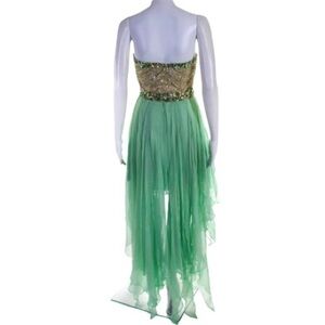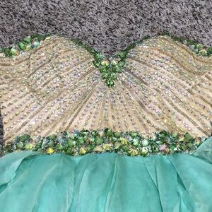 New without tag no flaws. Strapless, sweetheart neckline, padded and boned bodice, fit and flare silhouette high low hem ruffle accent dress. Pastel pistachio green with gold bodice. The bodice has green and aurora borealis rhinestone crystals and beads. Style 1920 in a pastel green with gold bodice.