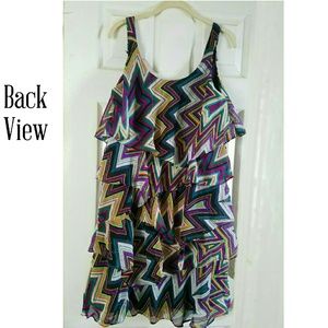 The dress has 5 layers of a multicolored zig zag print. It has a scoop-neck w/medium size strap. The bk is similar to the front but the scoop-neck is higher. This flirty dress has never been worn & does not fit my mom or myself. It needs a new home.