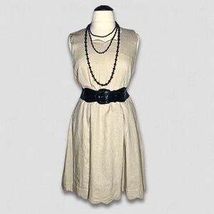 This Sigrid Olsen sleeveless midi dress features a neutral beige tone in a breathable linen-viscose blend. With a back zipper, two side pockets, and a flattering A-line silhouette, it's a versatile wardrobe staple.