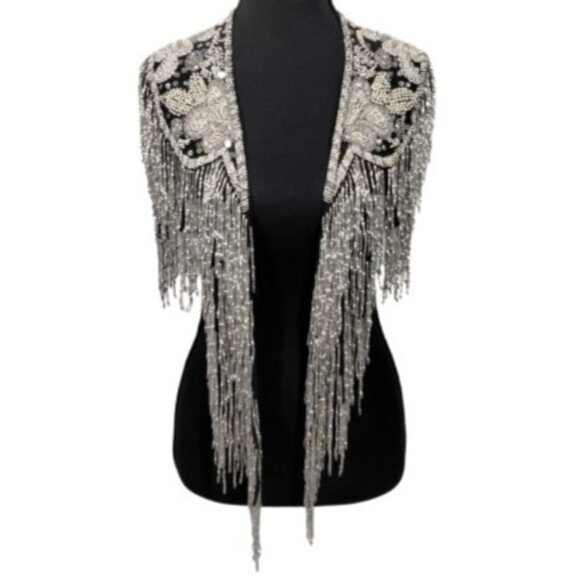 NWOT Silk Beaded Shawl Whimsigoth Boho Hippie Western Black Silver 90s Vamp