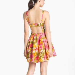Patterson J. Kincaid x Man Repeller “Kimmy” silk fit and flare dress. A sweetheart neckline, shimmering tropical print, centered gathers and revealing back cutout combine for a fun and flirty dress. Never worn and in perfect condition.