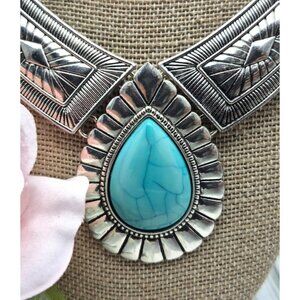 NWOT Silver Tone & Faux Turquoise Teardrop Bib Collar Necklace Southwestern 22"