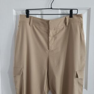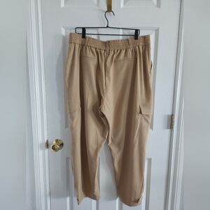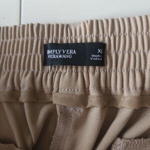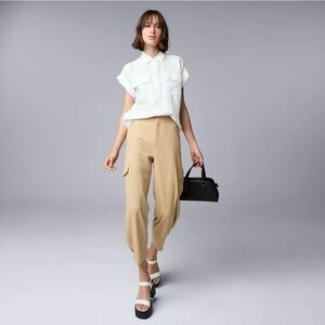 New without tags- Sold out style of Simply Vera By Vera Wang pants featuring a high rise fit, ankle length, 4 front pockets including side cargo pockets, button and zipper front with hook eye closure, belt loops, back elastic waistband, fitted through hip and thigh and a 7 inch leg opening with button detailing. Color is Vera Desert Khaki.